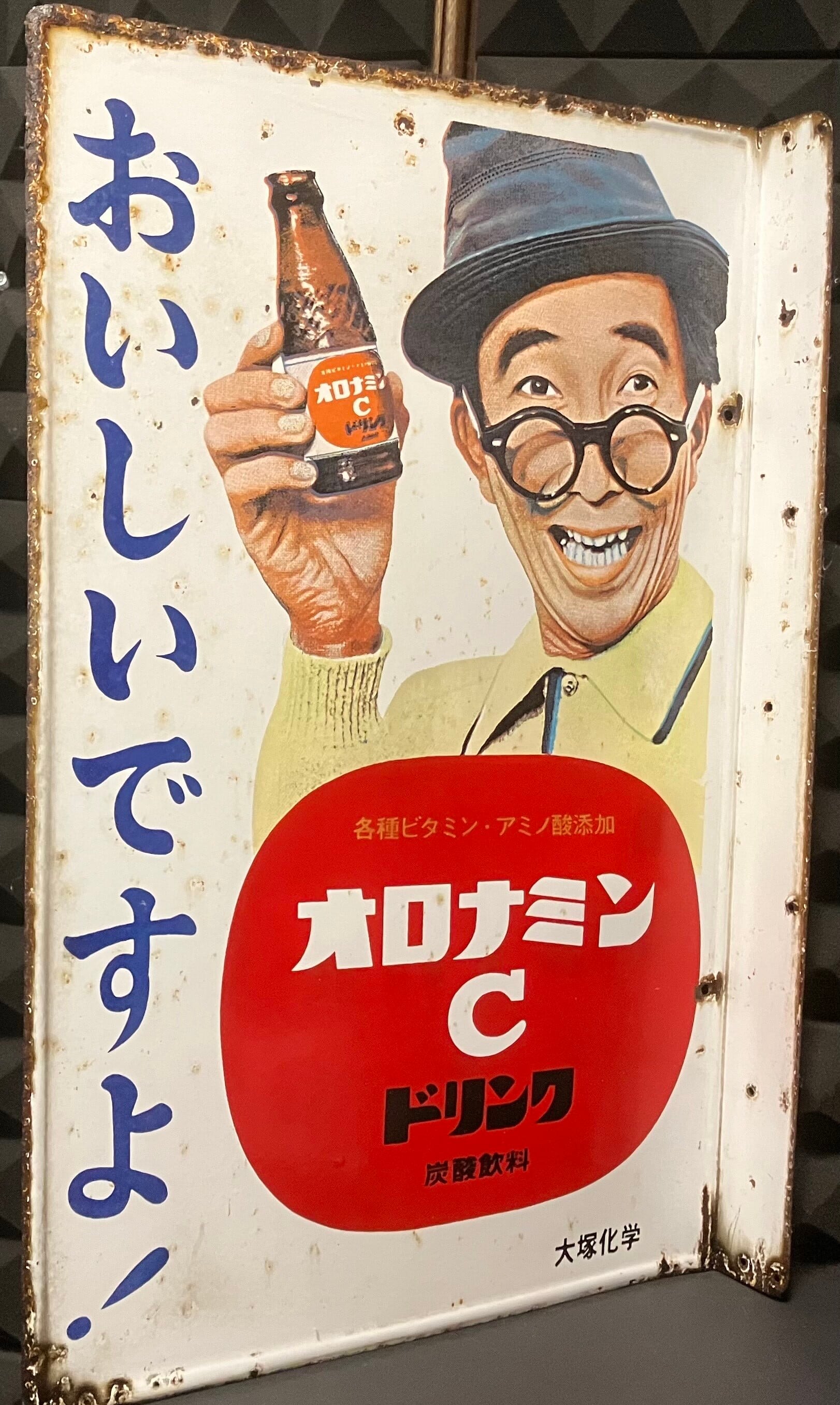 大塚化学 表記のオロナミンCの表裏両面タイプホーロー看板です。大村崑さんのこの表情はオロナミンCホーロー看板の初期、昭和40年頃の希少なものです。