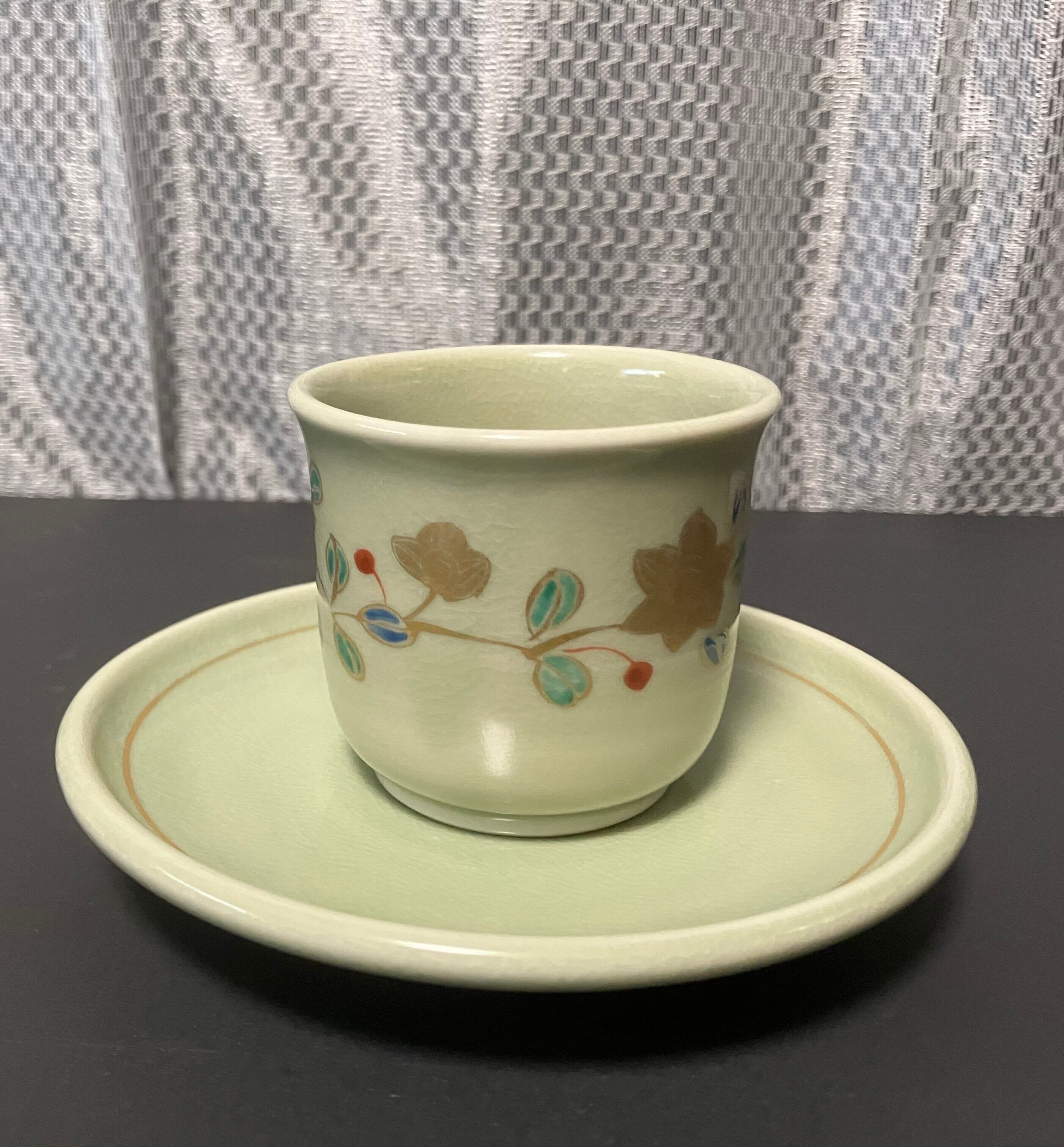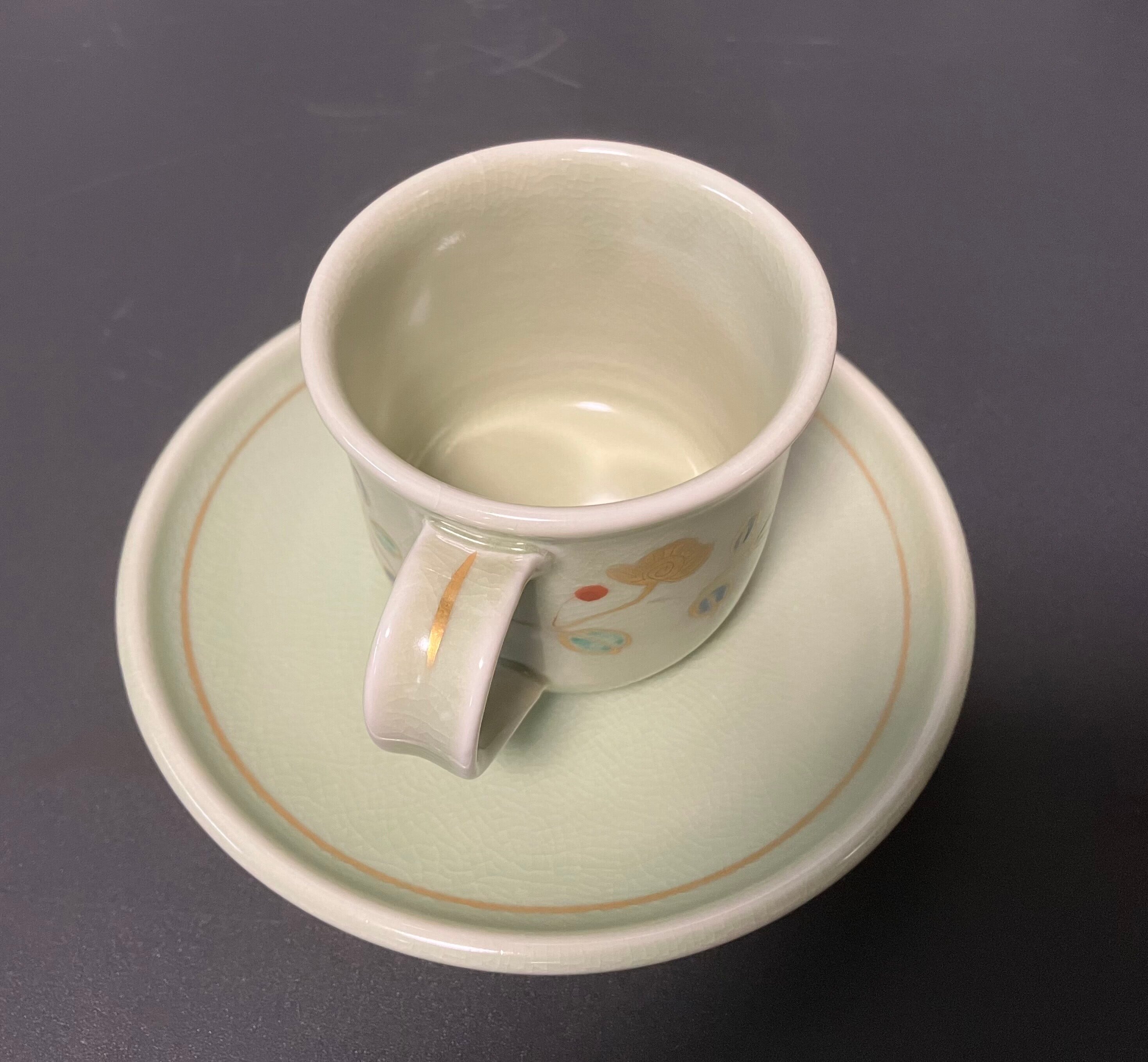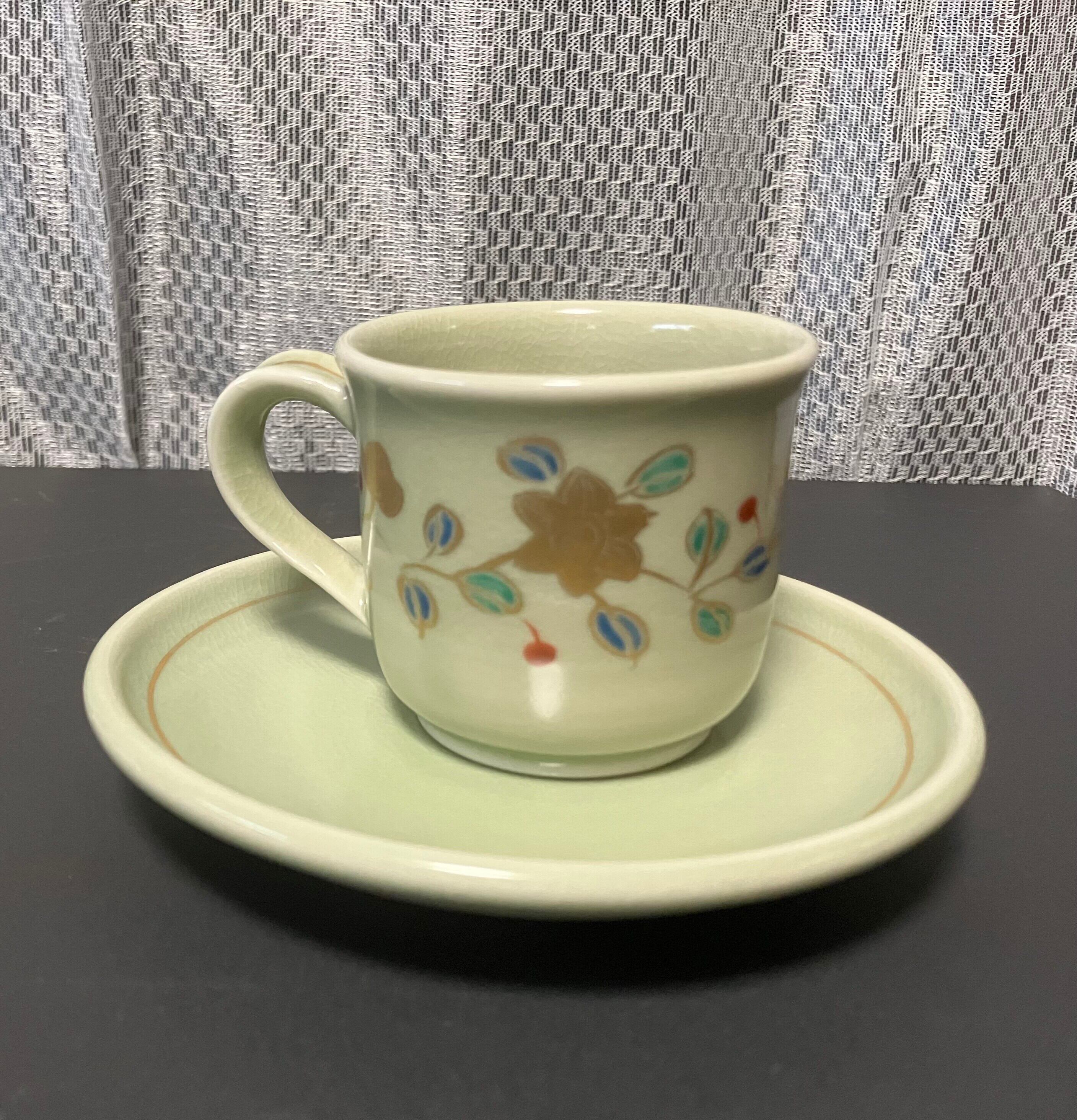 美しい色合いと繊細なデザインが特徴の金色彩が入った花を描いた、全体的に柔らかな色合いの九谷焼コーヒーカップとお皿のセットです。(撮影時の光の加減で少し見え方の色合いが異なります)