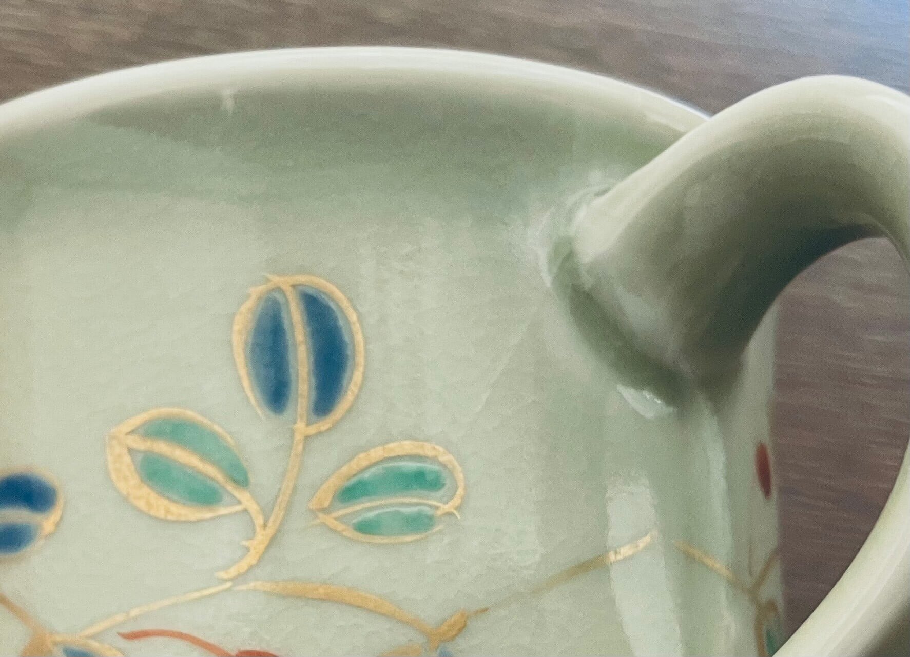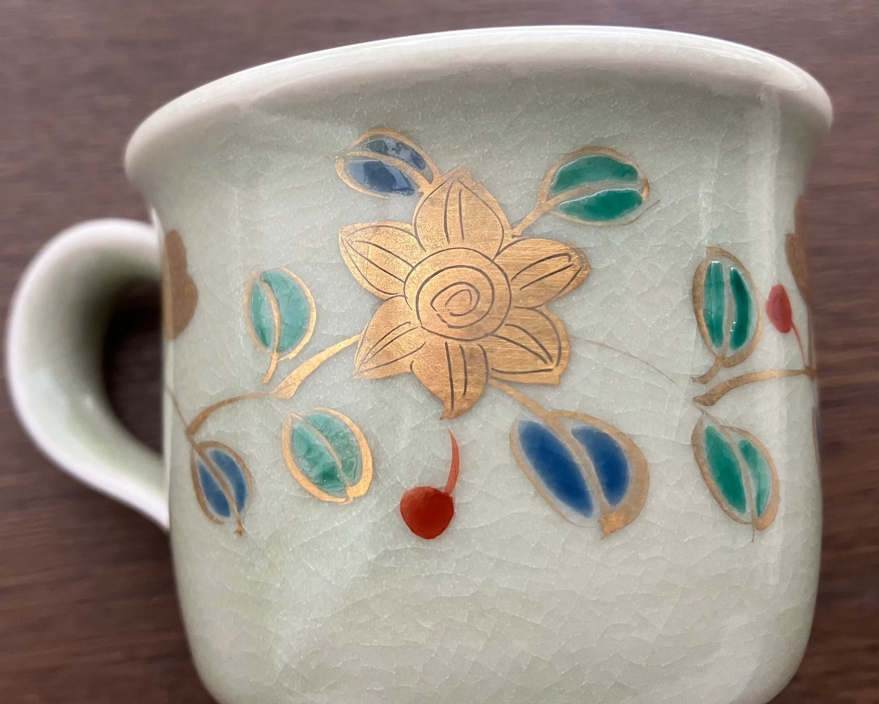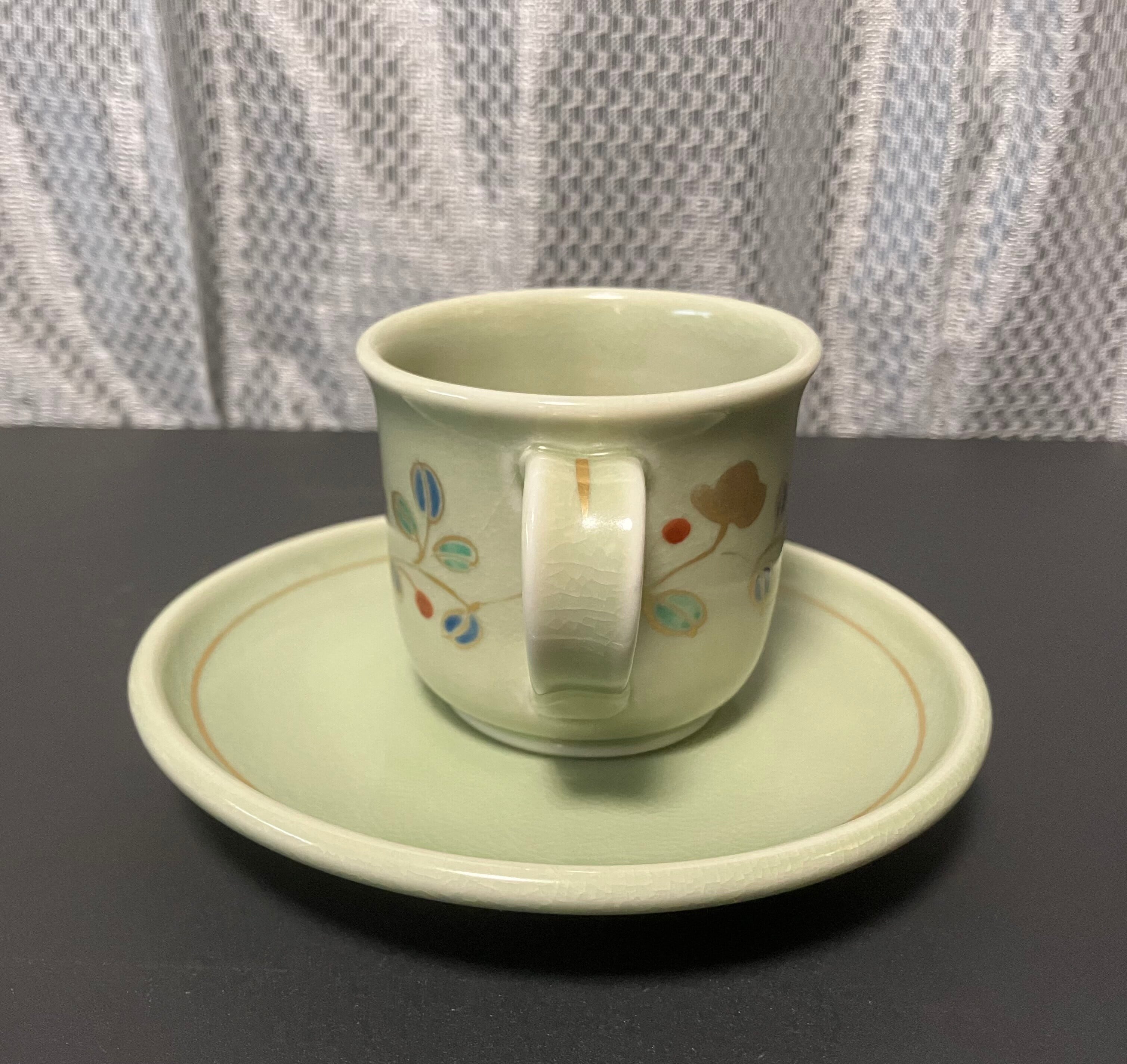 美しい色合いと繊細なデザインが特徴の金色彩が入った花を描いた、全体的に柔らかな色合いの九谷焼コーヒーカップとお皿のセットです。(撮影時の光の加減で少し見え方の色合いが異なります)