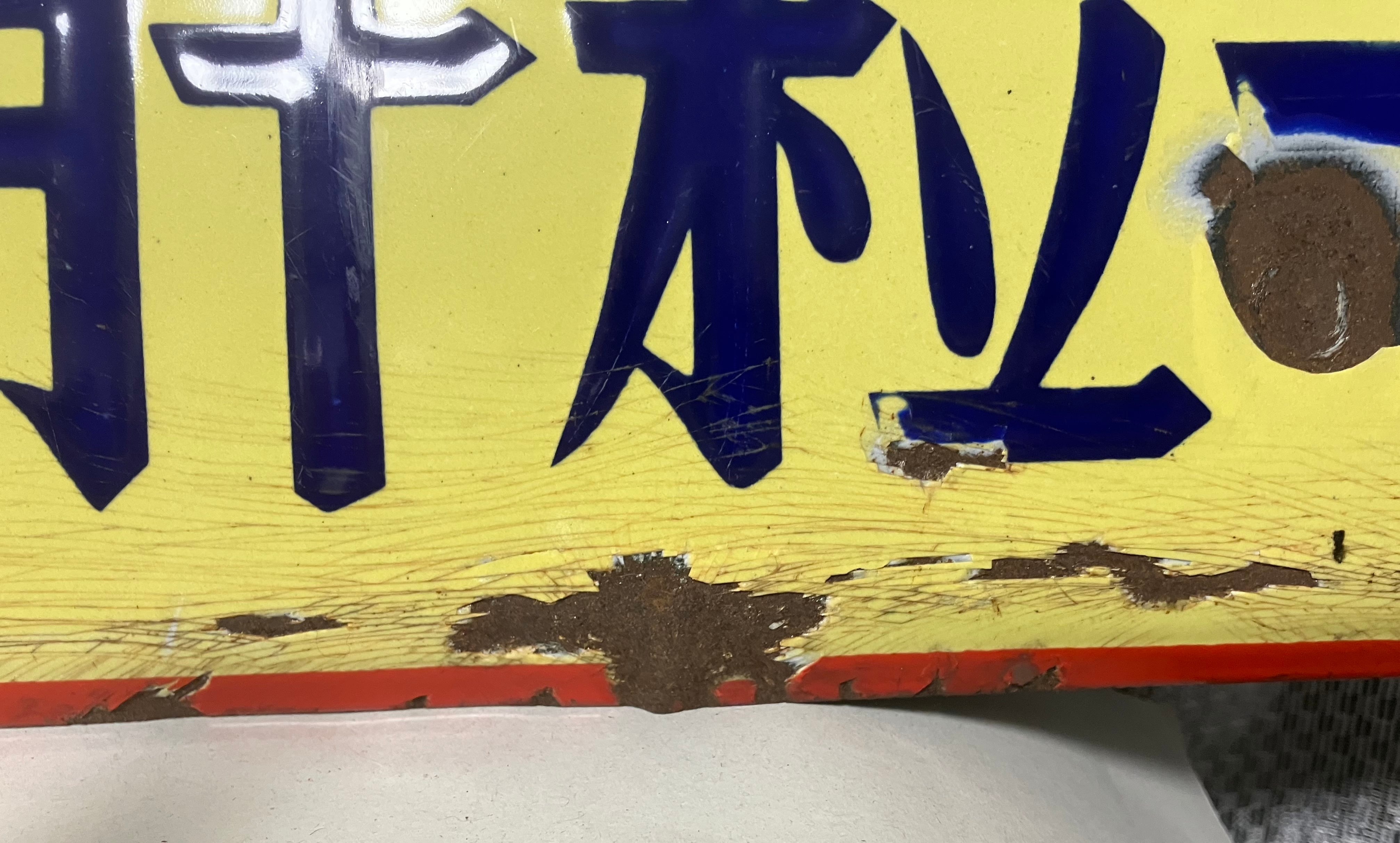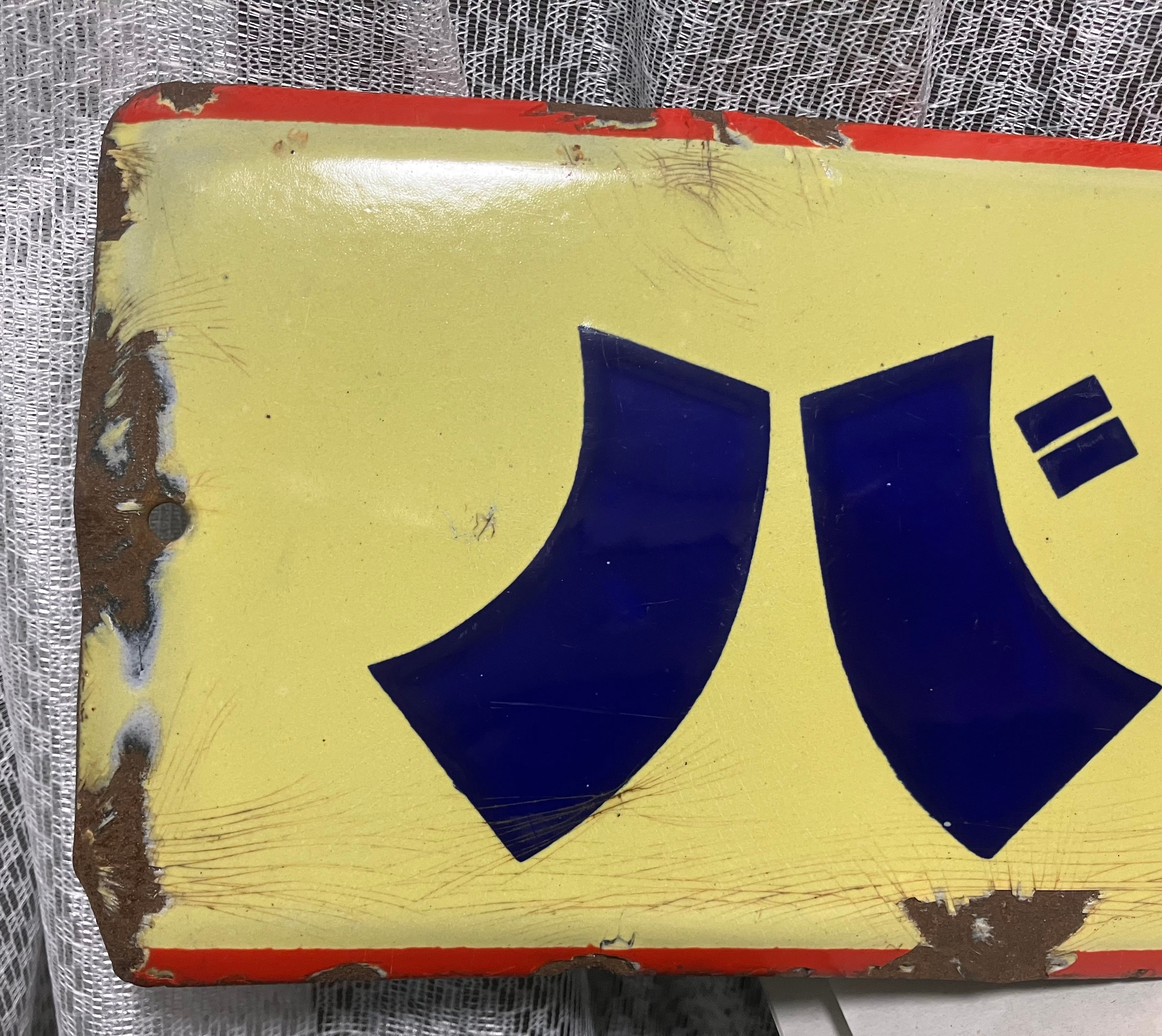 80年以上の歴史を持つホーロー看板ですが、光沢もあり未だに琺瑯の艶を保っています。経年による大きなサビや擦れ、削れ等はありますが、それが逆に味わい深い景色を生んでおり、なんともいえぬ郷愁を感じます。